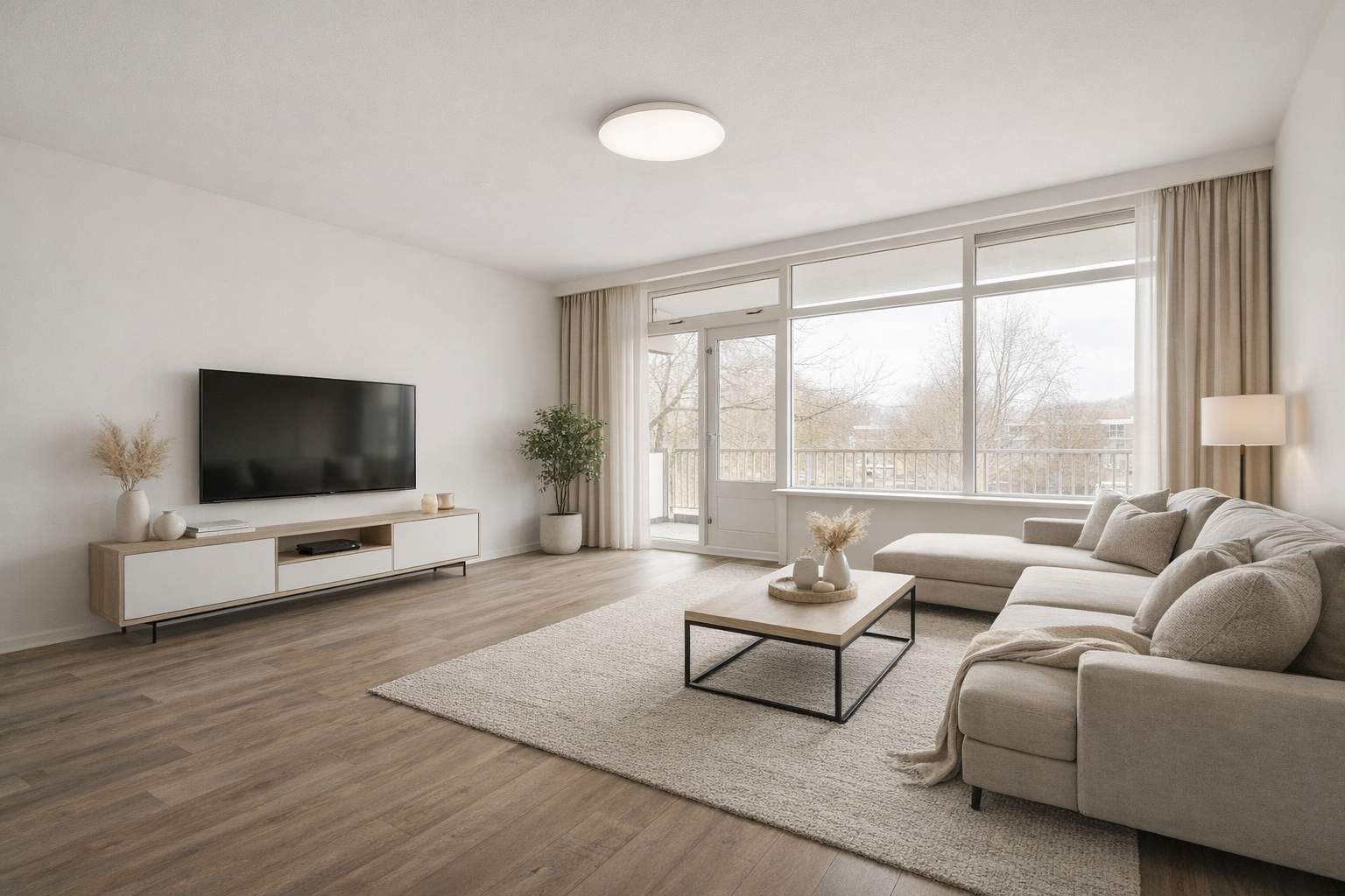 Lichte woonkamer met half ruimte t.b.v. de keuken. Vanuit de woonkamer heeft u toegang tot het op het noordwesten gelegen balkon met mooi uitzicht over het park.